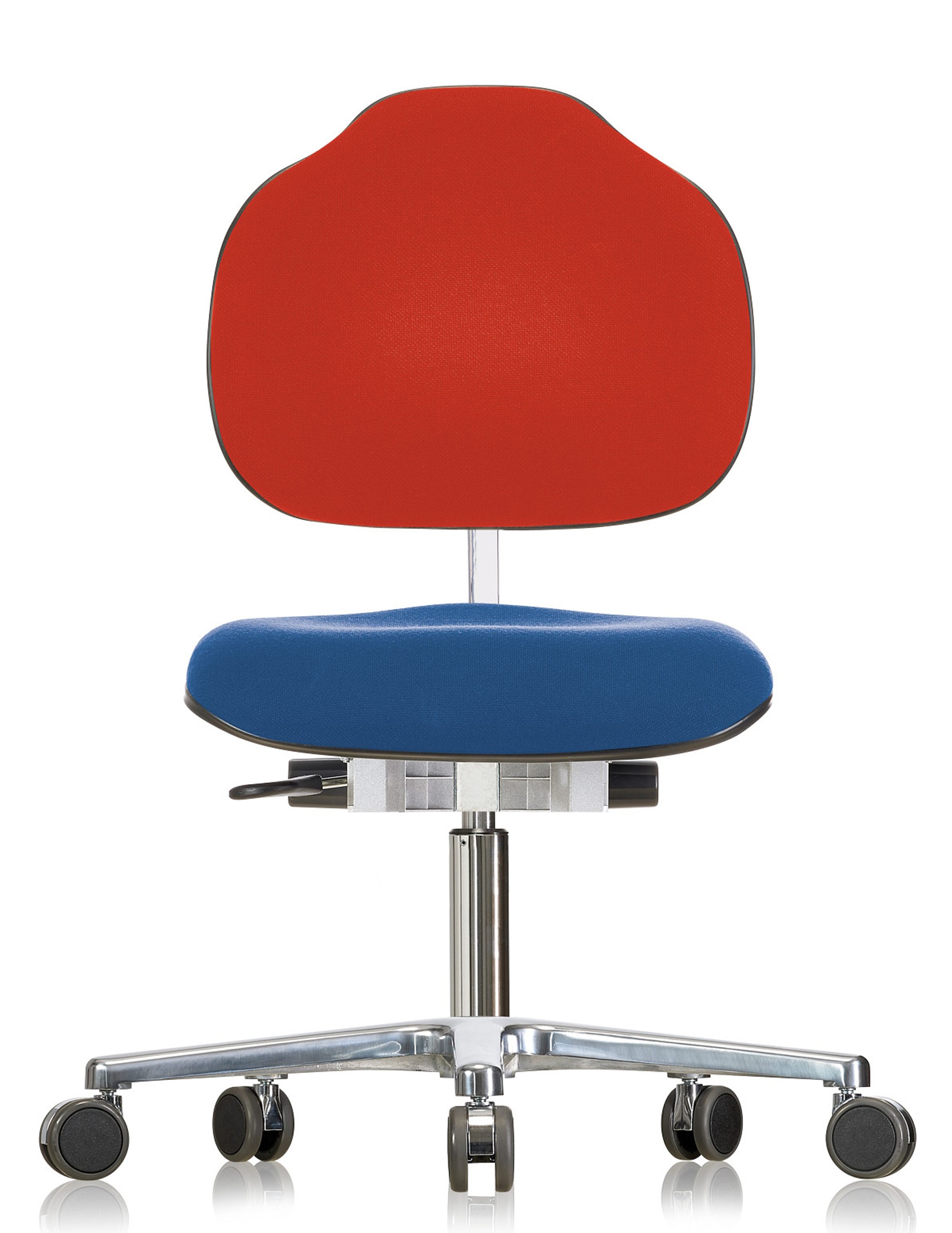Die komfortable Stoffpolsterung von Sitz- und Rückenfläche sorgt für ein angenehmes Sitzgefühl und unterstreicht den wohnlichen Charakter, der sich perfekt in kinderfreundliche Einrichtungen einfügt. Gleichzeitig bietet der Stuhl durch das polierte Aluminium-Flachfußkreuz mit hochwertigen Rollen Ø 65 mm eine stabile, leicht bewegliche Basis für den flexiblen Einsatz in verschiedenen Raumsituationen.