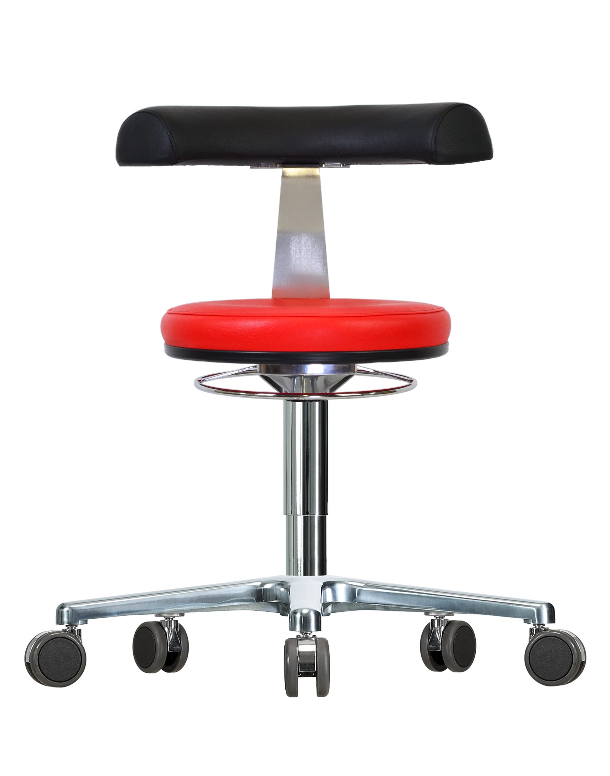 Dank der stufenlosen Höhenverstellung kann der Hocker individuell an die Körpergröße und Arbeitssituation angepasst werden. Der stabile Aluminium-Flachfuß mit hochwertigen Rollen (Ø 65 mm) sorgt für sicheren Stand und ermöglicht dennoch ein leichtes Rollen und Positionieren im Raum.