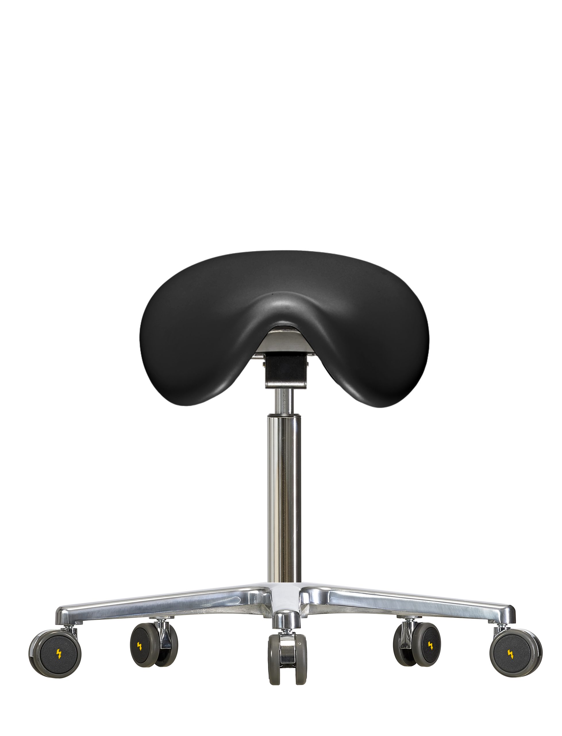 Der ergonomisch geformte Sattelsitz, gepolstert mit pflegeleichtem Kunstleder in Schwarz, bietet auch bei längerer Nutzung ausgezeichneten Sitzkomfort und fördert eine aufrechte, rückenschonende Haltung. Durch die stufenlose Höhen- und Neigungsverstellung lässt sich der Hocker individuell an den Nutzer und die jeweilige Arbeitssituation anpassen.