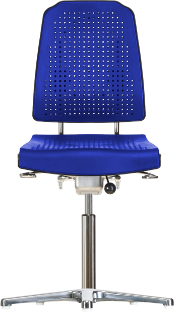 Das polierte Alu-Flachfußkreuz mit Gleitern garantiert einen sicheren Stand und verleiht dem Stuhl eine moderne Optik. Die verwendeten Materialien sind langlebig, hygienisch und bestens für den rauen Arbeitsalltag geeignet.